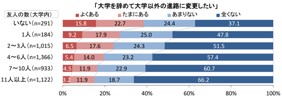 図1. 「大学を辞めて大学以外の進路に変更したい」と思う頻度(話をしたりする友人の数[大学内]別)