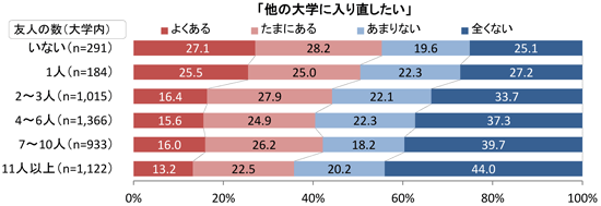 図2. 「他の大学に入り直したい」と思う頻度(話をしたりする友人の数[大学内]別)