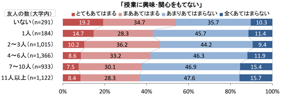 図3. 「授業に興味・関心をもてない」と感じる度合い(話をしたりする友人の数[大学内]別)