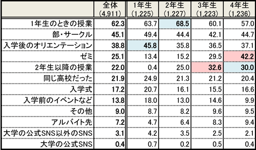 また、3、4年生に注目してみると、やはり「1年生のときの授業」が最も多い回答となっており、「部・サークル」「入学後のオリエンテーション」も4年間を通じて高い割合を示している。1年生の時に出会った友だちは、3、4年生になっても付き合いが続いており、1年生の時に築いた友人関係は、その後の大学生活を通して継続しているという様子がうかがえる。