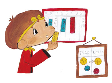 ホワイトボードに下校後のタイムテーブルを書き込みます。マグネットプレートに「あそび」「しゅくだい」「ならいごと」「おふろ」などのタスク(やること)を書いて、予定の時間に貼っていきます。こうすると、遊びすぎて宿題ができなければ、寝る前の自由時間を減らしてそこに宿題を入れなければいけません。「宿題は必ずやる」「寝る時間は変えない」というのがルールです。