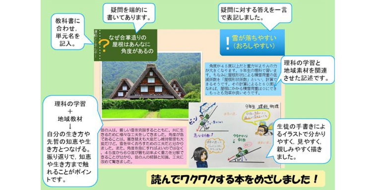 「総合的な学習の時間」を活用して、独自教科「村民学」をより発展させようと作成したオリジナルの理科の教科書(上)。地域の身近な素材で理科を学ぶ。制作には生徒も加わった。給食の時間は縦割りの「結クラス」で食べることも(下)。