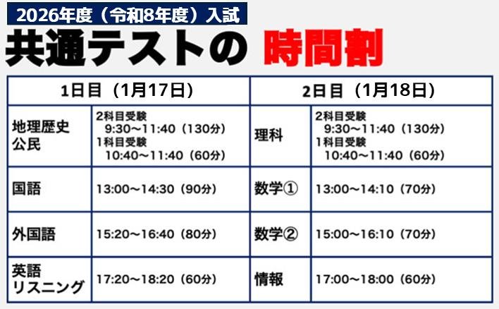 ちなみに2026年度入試の本試験の時間割は次のとおりです。