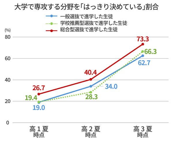東京大学社会科学研究所とベネッセ教育総合研究所が共同で実施している調査でも、総合型選抜で進学した生徒は、比較的早い段階から「何を学びたいか」を具体的に考え始める傾向が見られます。