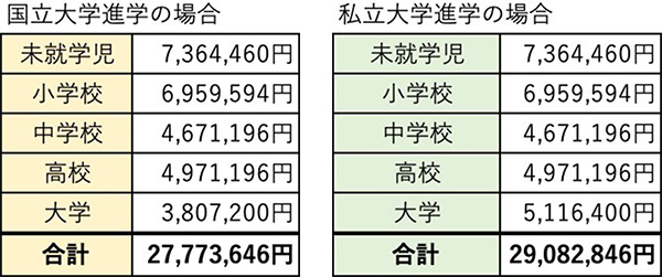 「高校受験・大学受験に向けて塾に通わせるか」「大学で文系学部・理系学部のどちらを選ぶか」「自宅から通うか否か」などによって金額は大きく変わります。