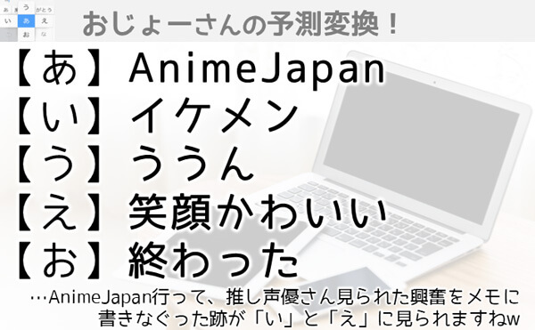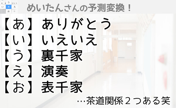 以上、「あ行」の予測変換についてはたとえばこんな形ということで、推し系が多いのも印象的ですが、子どもたちは各自スマホで、趣味嗜好(しこう)に基づいたコミュニケーションを行っているようです。