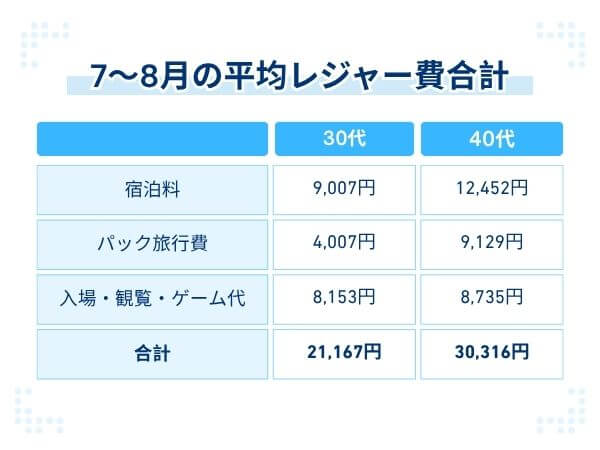 表を見ると、7~8月の夏休みのレジャー費の平均合計金額は、30代で約2.1万円、40代で約3万円です。40代のほうが高い傾向にあるのは、お子さまの年齢が上がり、宿泊費や施設の入場料が高くなるためと考えられます。