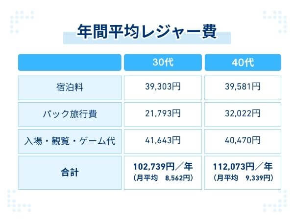 上記のレジャー費には、外食費や交通費、ガソリン代などは含まれていないため、実際はさらに費用がかかっています。一方、ここで30代・40代の年間のレジャー費の平均額を見てみましょう。