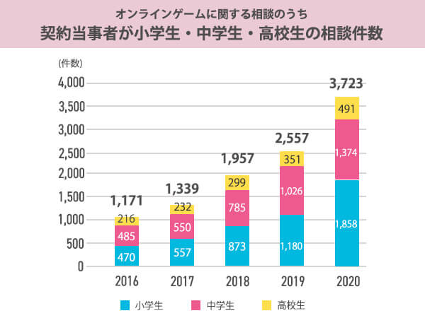 国民生活センターによると、2016年度から2020年度の小学生・中学生・高校生のオンラインゲームに関する相談件数は増加傾向です。