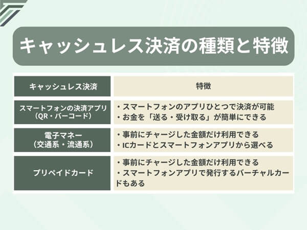 お子さまとの話し合いの結果、キャッシュレスお小遣いを取り入れようとなったら、お小遣いを渡すキャッシュレス決済を決める必要があります。子どもが使えるキャッシュレス決済の種類と特徴は以下のとおりです。