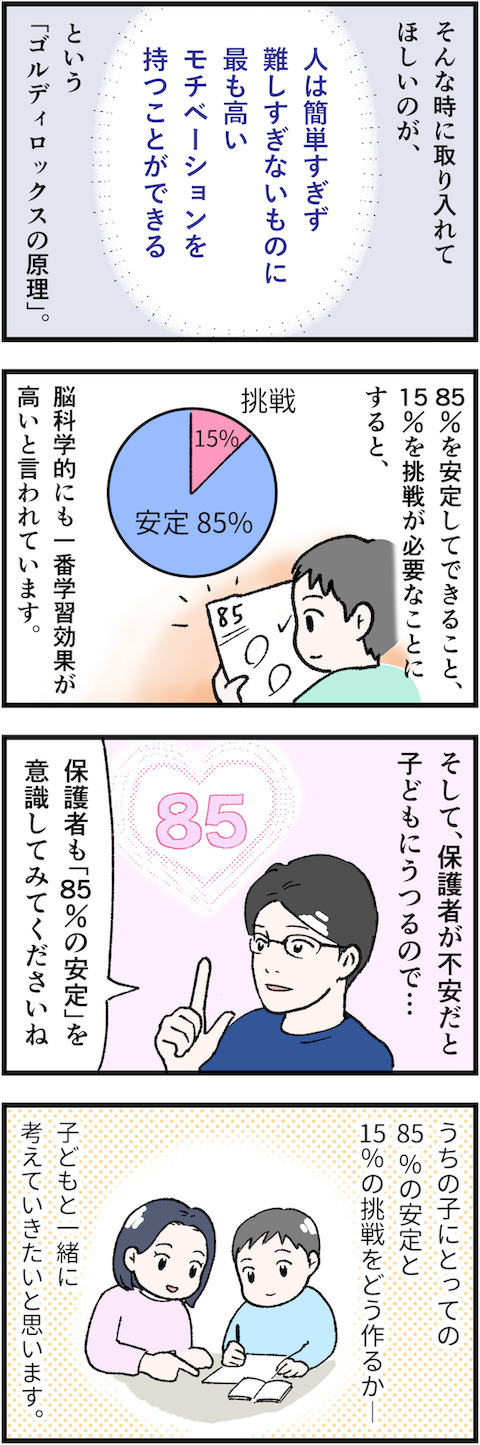 感じ方が鋭敏すぎて子どもが拒否する場合、感じない大人の立場からは「やりたくないから甘えているだけではないか?」と悩むこともあるかもしれません。そこで、「ゴルディロックスの原理」(マンガ参照)を紹介しました。ストレス値の少ない環境で、楽しく少しずつチャレンジし続けること。「この挑戦によって新しい自分に出会える」という経験が、人生そのものの楽しさにつながることを、子どもだけでなく保護者にも伝えたいと締めくくられました。