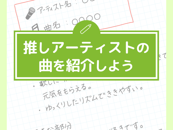 ②そのアーティストの曲を1つ挙げ、特長を簡単にまとめます。たとえば「●●さんの『●●』という曲は、力強いメロディーと元気が出る歌詞が特長で」など、自分が感じた魅力を短く書きます。