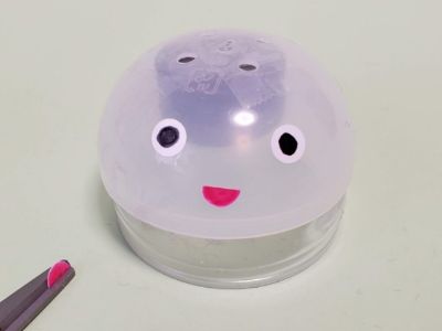 切ったモールを上からふりかけると、かみの毛が元気にさかだつ「磁石さん」のできあがり! 下のケースをおさえて上のケースを動かすと、モールが動いてかみがたがかわるよ。