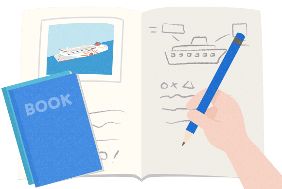 フェリーで「運ぶ」ことについて、どんなことを知りたいかな?小さな「なんで?」が大きな発見につながるかもしれないよ。思いついたことは、どんどん書いてみよう。
