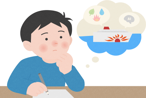 これからの社会の移動や物流に求められるものはどんなことかな?その中で、フェリーが果たせる役割とは?そのために、どのような進化が求められるんだろう?効率や安全性はもちろん、環境配慮や社会課題解決などさまざまな観点から、正解のない問いにチャレンジしてみよう。
