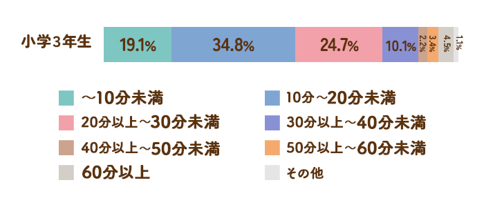 3年生の家庭学習時間で最も多かったのは「10分~20分未満」(34.8%)でした。また、78.6%の子どもが「家庭学習の時間は30分未満」という結果になっています。