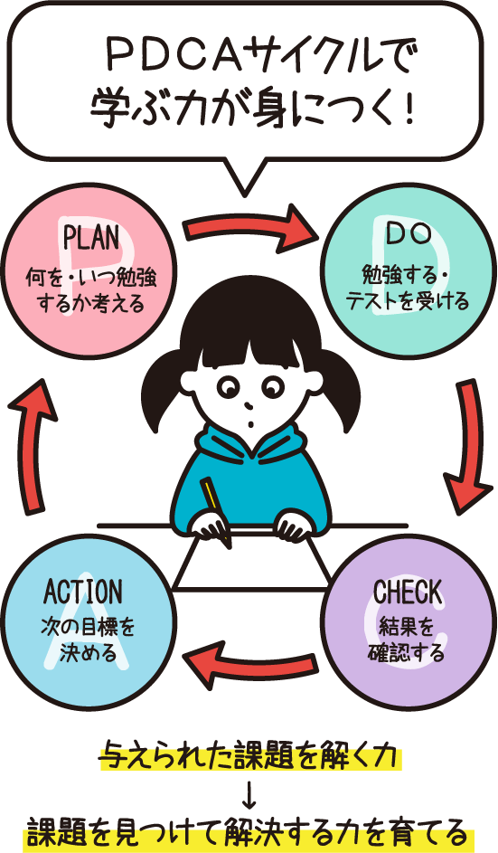 塾なし学習の基本は、目標を決めて計画的に勉強するということ。はじめは1〜2週間の小さな目標でも十分。親のサポートがあれば、気軽に取り組めます。どんなに短期間、小さな目標であっても、何を・どの教材で・いつ・どう勉強するかを考える経験は貴重。これが成功体験になれば、次第に自分から目標を決めて学ぶ「本物の学力」がついていきます。