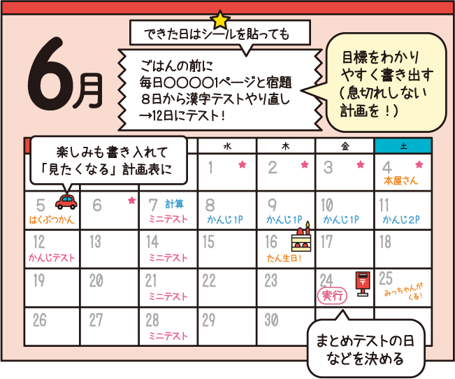 「勉強すると、わかることが増えていく」「問題が解けると楽しい」といった感覚を知ると、子どもは自分から積極的に勉強するようになっていきます。計画表に慣れるには、好きな教科の得意を増やすことを目標にするのもおすすめ。意欲がわくような目標設定や教材選びを意識してみて。