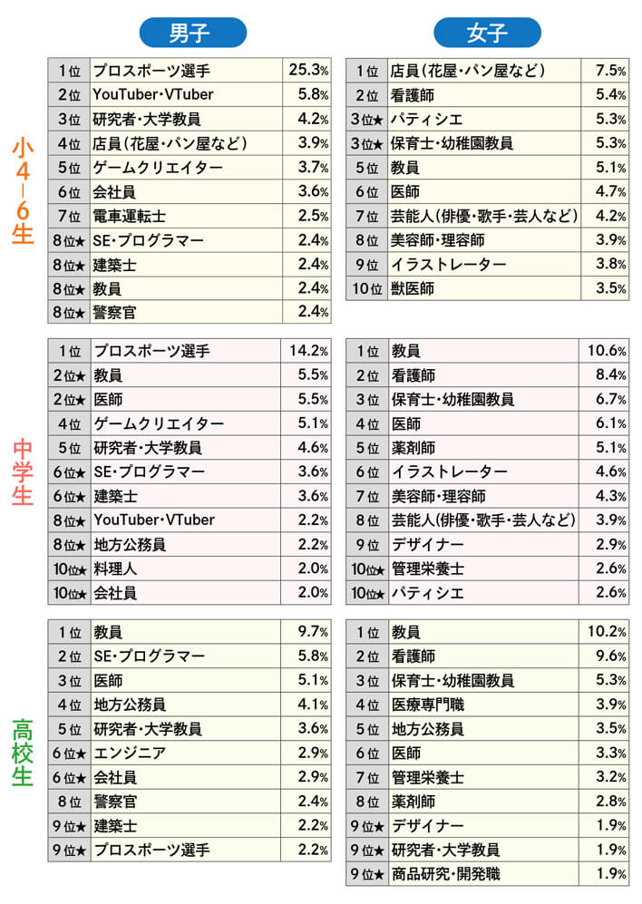 中学生になると、男子は「プロスポーツ選手」に加え、「教員」「医師」「ゲームクリエイター」などが人気を集め、女子は「教員」「看護師」「保育士・幼稚園教員」「医師」などが上位を占めます。