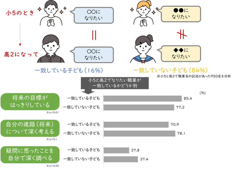 さらに、小学生のころから希望する職業が変わらなかった子ども(一致した子ども)と、途中で変わった子ども(一致しなかった子ども)を比較したところ、興味深い違いが見られました。小さいころから希望が変わらない子どもは、「将来の目標がはっきりしている」という強みを持つ一方で、「自分の進路について深く考える」、「疑問に思ったことを自分で深く調べる」機会が少ない傾向が見られました。
