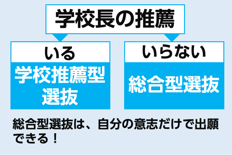 「学校推薦型選抜」には校長先生の推薦状が必要で、「総合型選抜」には推薦状は必要ありません。自分の意志のみで出願できます。