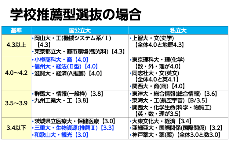 推薦入試は、大学や学部、学科によって成績基準や選考方法が異なります。