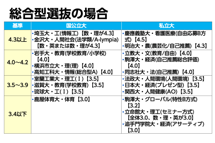 - スポーツや文化活動、課外活動などの実績が評価されるのが特徴。評定平均値に基準があることは少なくなっています。