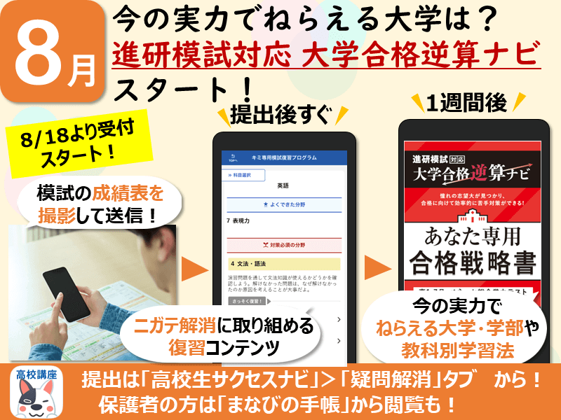 そこで、8/18から受付が始まる「進研模試対応 大学合格逆算ナビ」をご紹介します。