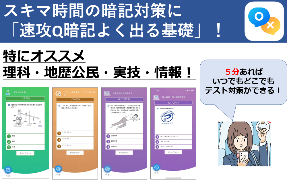 そして、スキマ時間の対策でおすすめなのが「速攻Q暗記よく出る基礎」アプリです。