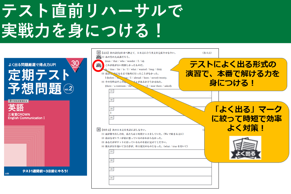 テスト直前は、本番でしっかり解けるようになるためにも、テスト形式の問題演習がオススメです。