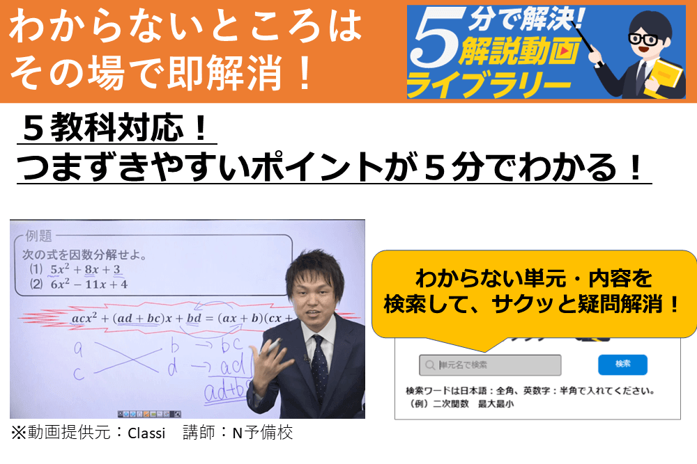 5教科約1,900本の動画が見放題で、単元ごとにつまずきやすいポイントをわかりやすく解説しています。1回5分で見られるので、わからないところがあればサクッと検索して、理解することができます。