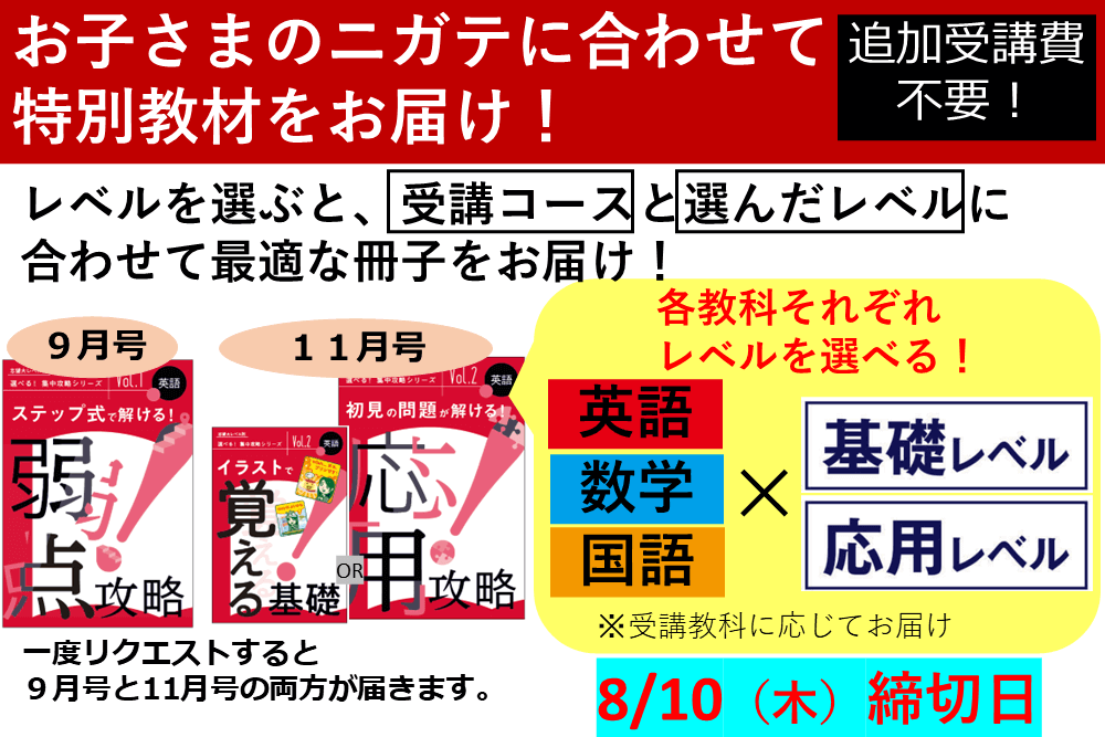 ※「ステップ式で解ける!弱点攻略」は9月号在籍者、「イラストで覚える!基礎」または「初見の問題が解ける!応用攻略」は11月号在籍者で、8/10までにリクエストした方に別送でお届け。