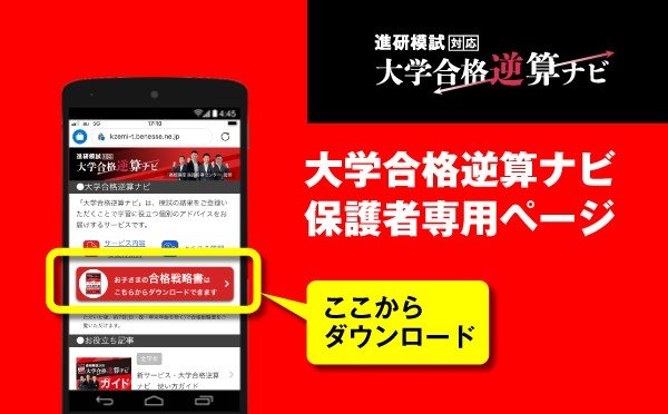 進研模試/ベネッセ総合学力テストの「個人成績表」がお手元に届いたら、「サクセスページ」>「大学合格逆算ナビ」からお子さまが模試の結果をご提出ください。