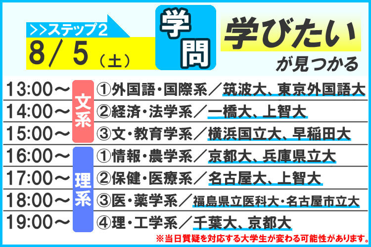 オンラインオープンキャンパス【ステップ2】学問を知る!系統別の説明や違いを解説&各大学の先輩チューターが登場