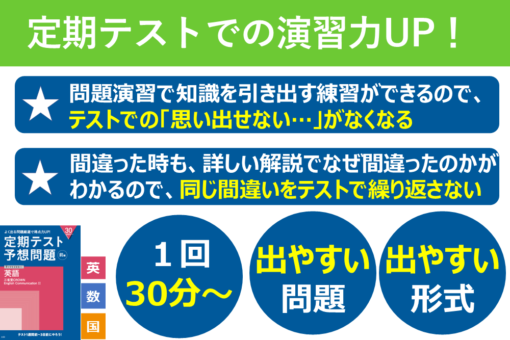 そこで、おすすめなのが、テストに出やすい問題を出やすい形式で効率的に演習することができる『定期テスト予想問題』です!