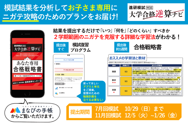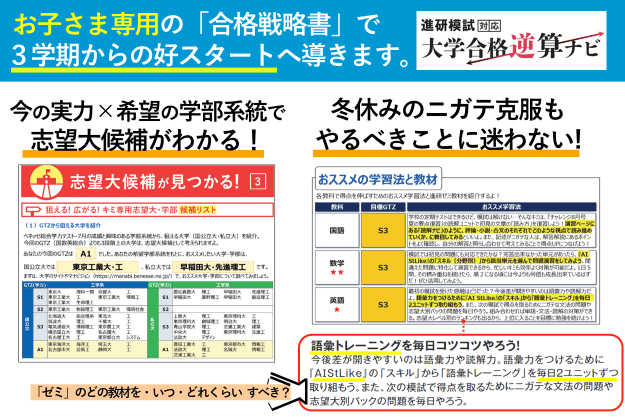 そして送信後約1週間で配信される「合格戦略書」では、今の成績と希望進路からねらえる志望大の選択肢や、「ゼミ」教材を使った冬から3学期にかけての学習法をお伝えします。