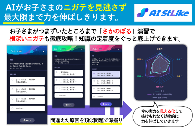 冬休みの課題でつまずいた時にも、「AI StLike」でニガテの根本原因に向き合って解消していけるので、お子さまが課題に取り組む際に「手が止まる時間」を減らし、効率的に力を伸ばしていけます。
