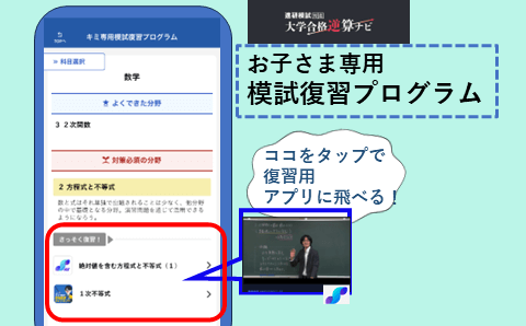 今回の模試でお子さまが最もニガテだった分野に絞りこんだプログラムなので、お子さまは自分で復習する分野や教材を探さなくていいし、アプリの解説動画や演習にタップしてすぐ飛べるから、サッと復習に取り組めるんです。