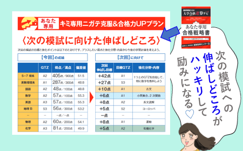 西野:ええ。さらに後日届くお子さま専用の「合格戦略書」には、次回の模試までの伸ばしどころポイントも各教科具体的に書いてあります。