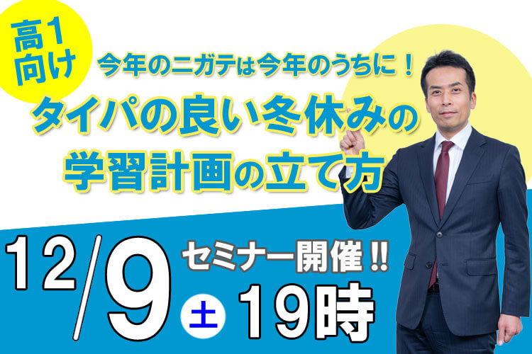 高1生のお子さまが、冬休み期間を活用して効率的にニガテを克服する方法を紹介する、12月9日(土)開催の進路セミナー『今年のニガテは今年のうちに!「タイパの良い冬休みの学習計画」の立て方』のお知らせです。