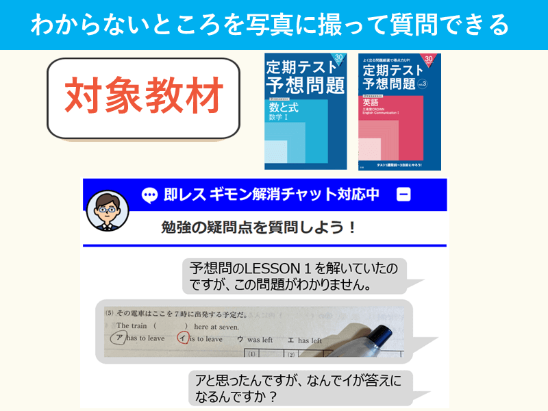「即レス!ギモン解消チャット」とは、数学と英語の『定期テスト予想問題』のわからないところを質問すると、専門の教科アドバイザーがチャット形式でわかるまで教えてもらえるサービスです。