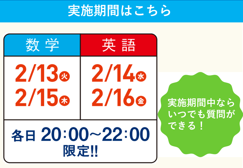 お子さまには、この実施期間までに『定期テスト予想問題』を解き、わからないところを洗い出しておくように促していただくと、より効率的に質問ができると思います。