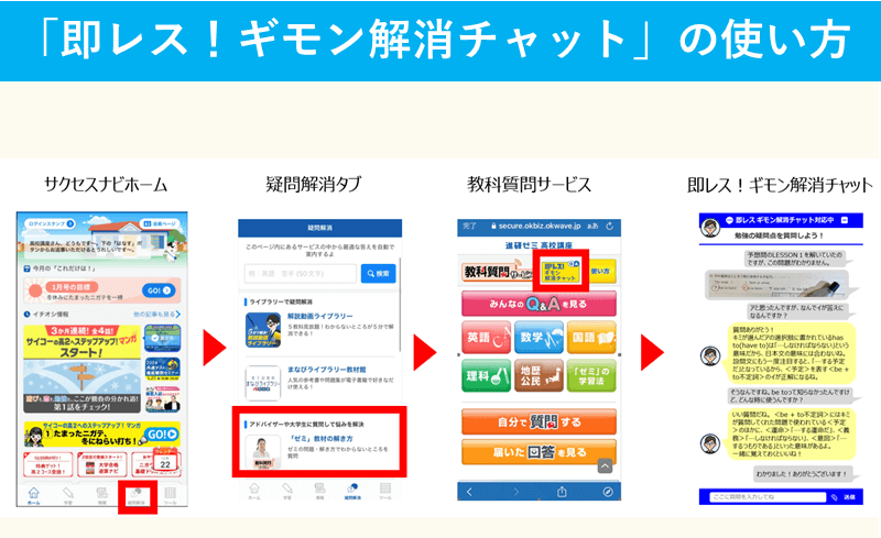 当日は「高校生サクセスナビ」アプリ内の「ホーム」にあるバナーから、または、「疑問解消タブ」の『「ゼミ」教材の解き方』をタップし、右上の黄色いバナーからチャット画面を開くことで利用できます。