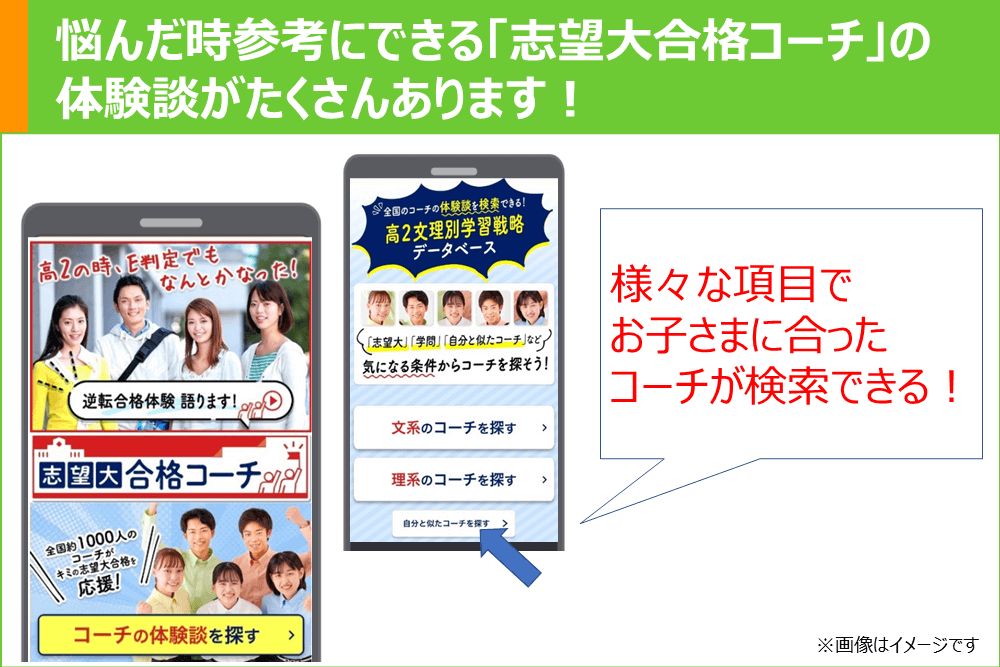 コーチたちの高校時代の部活やトクイ・ニガテ教科など、様々な項目で絞って検索いただけるので、お子さまと似たタイプのコーチの体験談が見つかり、すぐにでも役立てていただけるはずです。