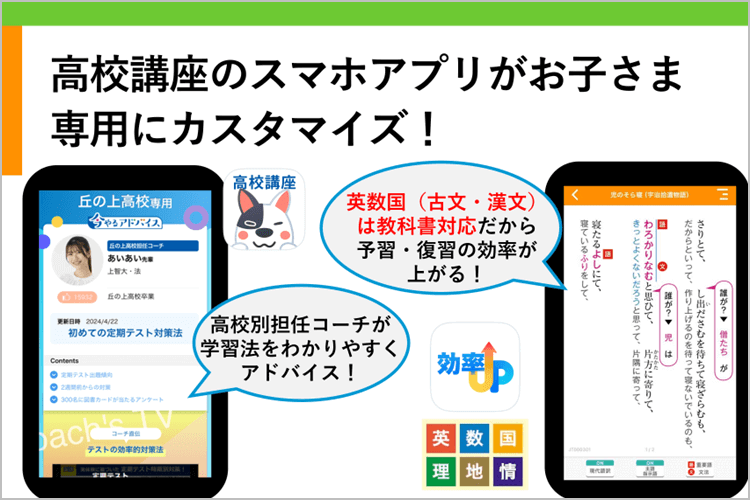 そのため、お子さまが通っている高校に合わせて勉強することが、効率的にテストの成績を上げていくための近道になります。