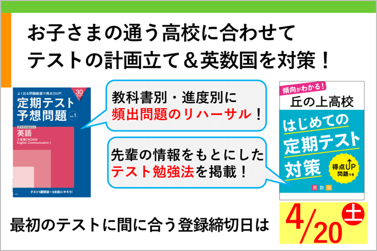 また、4/20(土)までに登録をすることで届けられる『傾向がわかる!はじめての定期テスト対策』には、先輩の情報をもとにしたテスト対策アドバイス・学習計画立てのコツを掲載。さらに、全国のテスト分析も踏まえ、高校の傾向に合わせた応用問題などの対策もできます。