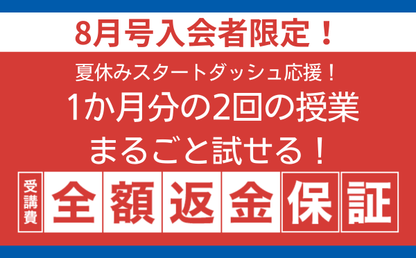 ※ご受講いただき合わないと感じられた場合には、9月2日(月)までに電話番号:0120-332211(9:00~21:00 通話料無料)に退会のお電話をいただければ、初月の受講費を全額返金します。ただし、手数料の返金は致しかねるため、お客様の負担となります。