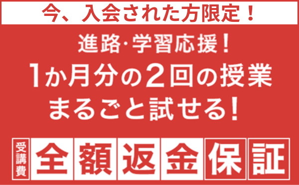 ※ご受講いただき合わないと感じられた場合には、高1・2生は10月1日(火)まで/高3生は9月2日(月)までに電話番号:0120-332211(9:00~21:00 通話料無料)に退会のお電話をいただければ、初月の受講費を全額返金します。ただし、手数料の返金は致しかねるため、お客様の負担となります。