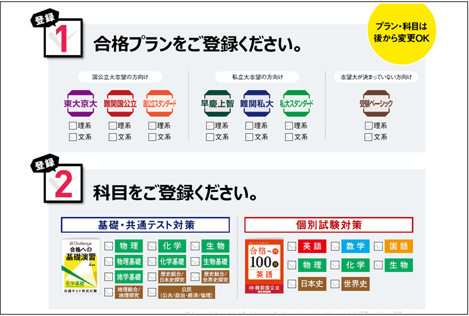 志望大合格に向けて万全の体制で進めていくために、「合格プラン」と「科目」を今すぐ登録してください!