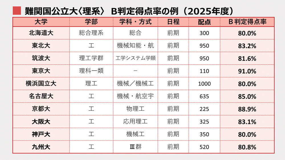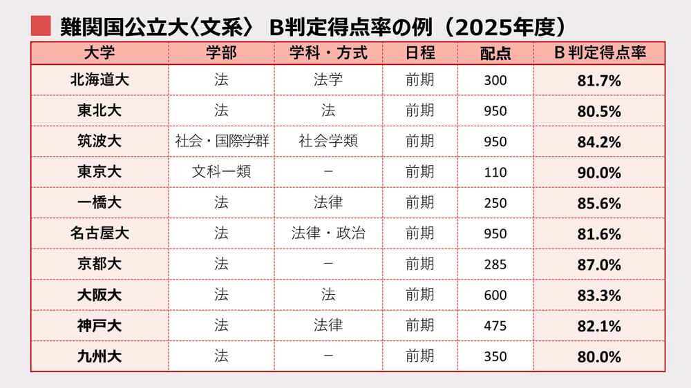 難関国公立大でB判定をとるためには、文・理どちらも得点率8割以上が必達目標です。